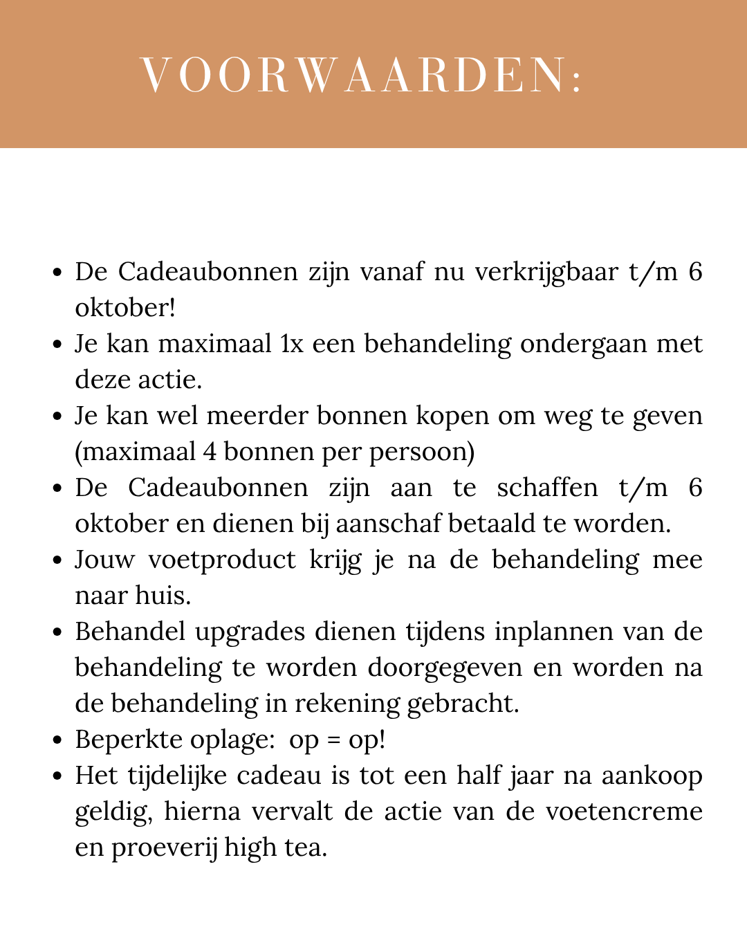 - Het tijdelijke cadeau is tot een half jaar na aankoop geldig, hierna vervalt de actie van de voetencreme en proeverij high tea.